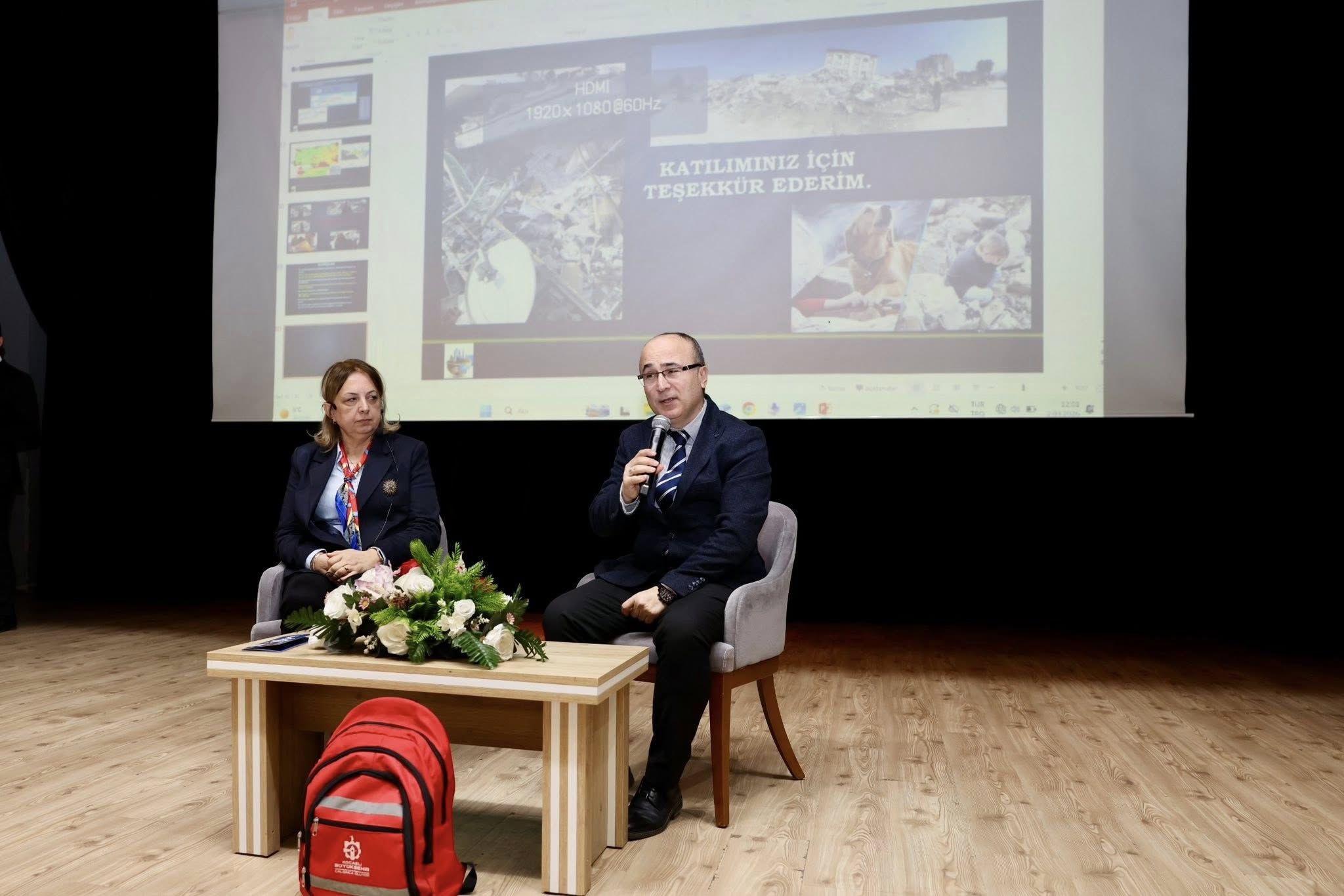 İlçe Milli Eğitim Müdürü Sergülen Kurt’un yaptığı kısa selamlama konuşması sonrasında kürsüye gelen Başkan Şener Söğüt, “Deprem kuşağında, deprem gerçeğiyle iç içe yaşayan bir ülkenin evlatları olarak hepimiz biliyoruz ki bunlara hazırlıklı olmalıyız. Bugün, bu konuda bilinçlenme ve ne yapılması gerektiğini konuşmak için buradayız. Hepimiz biliyoruz ki özellikle hafızalarımızda derin izler ve acılar bırakan depremi yaşamış bir şehir olarak, afet ve depremlere hazır olmalıyız.
